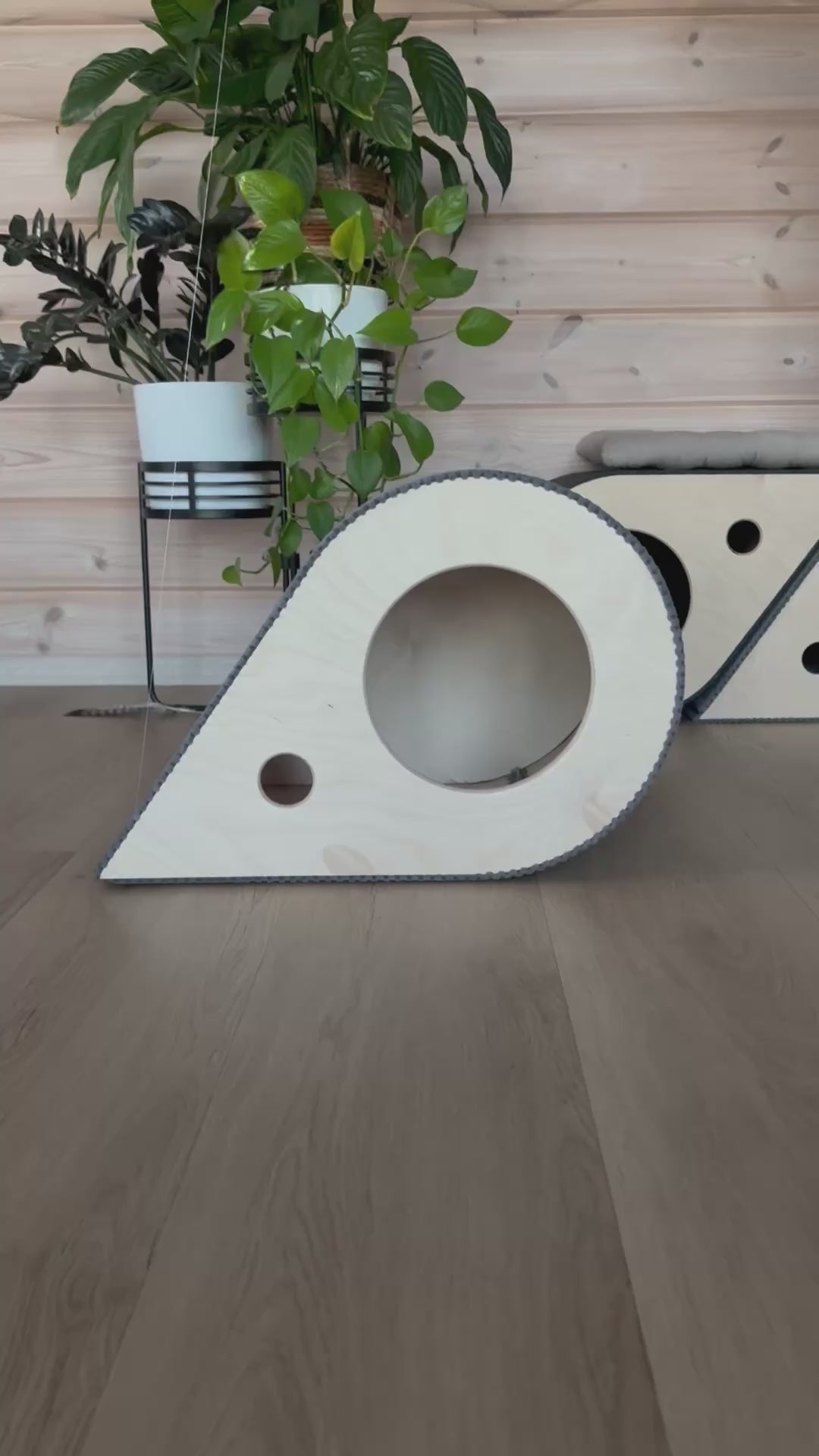 MIAUDROP - designerski domek 2w1: kryjówka + drapak. Ręcznie wykonany w Polsce ze sklejki, wykończony trwałą tkaniną drapakową.